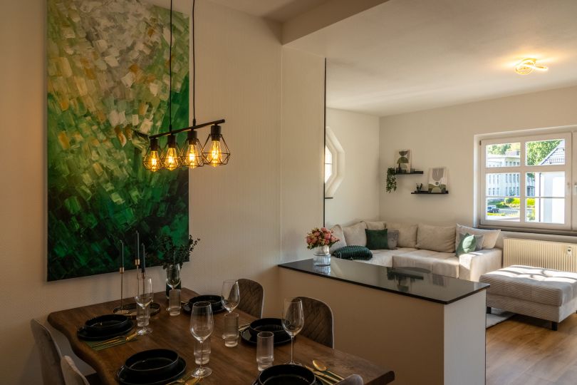 Die hochwertig sanierte Eigentumswohnung dieser in 2005 stilvoll umgebauten Fabrikantenvilla vereint historischen Charakter mit zeitgemäßer Wohnqualität. Auf ca. 86 m² Wohnfläche bietet sie drei gut geschnittene Zimmer, eine offene Küche uns einen großen, hellen Wohn-Essbereich sowie ein stimmiges Gesamtbild aus Großzügigkeit, Licht und klarer Raumstruktur. Die wunderschöne Wohnung wurde Anfang 2025 vollständig modernisiert – mit Echtholzparkett, großformatigen Fliesen, mattschwarzen Armaturen und strapazierfähiger Glasfasertapete. Diese hochwertige Ausführung schafft eine ruhige, elegante Wohnatmosphäre mit Blick fürs Detail. Ein besonderes Extra: Die Möblierung ist neu, hochwertig und im Kaufpreis enthalten. So können Sie direkt einziehen – ohne weiteren Aufwand. Der Balkon bietet zusätzlich einen privaten Außenbereich mit Ausblick ins Grüne. Neben einem eigenen Kellerabteil gehört auch ein Carport-Stellplatz zur Wohnung.