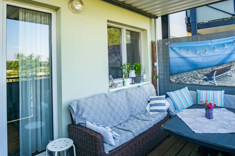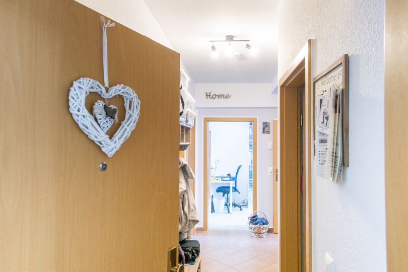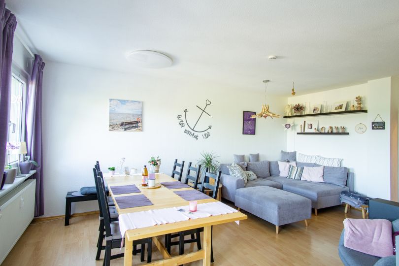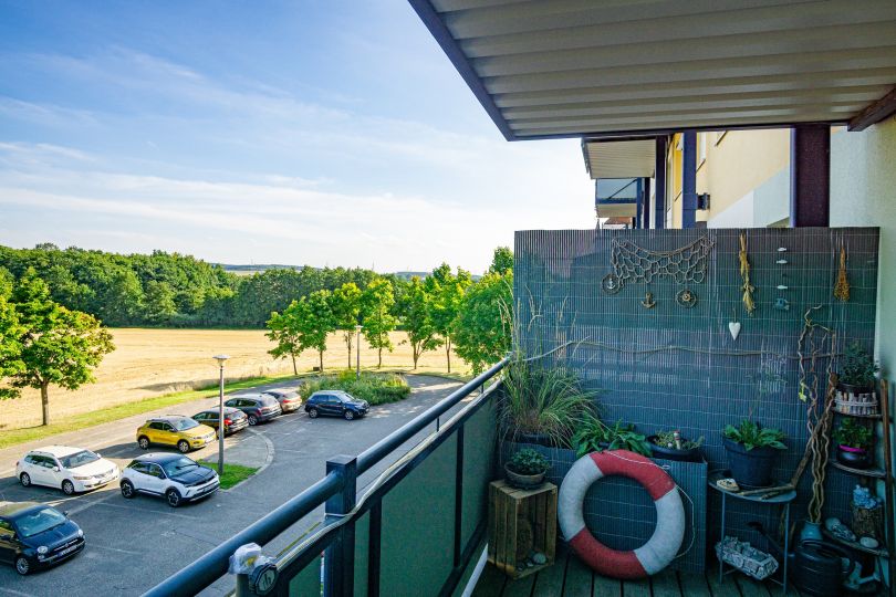 Maisonettewohnung, Ankleidezimmer, offener Wohn- und Essbereich mit Zugang zum Balkon, unverbauter Fernblick ins angrenzende Naturschutzgebiet, Einbauküche, Gäste-WC mit Waschmaschinenanschluss, gemeinschaftlicher Trockenraum, Stellplatz am Haus, Wohnlage in ruhiger Sackgasse mit Blick ins Grüne.