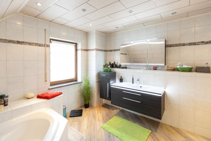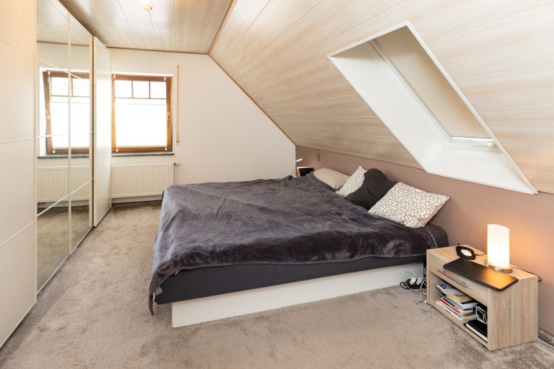 Im Dachgeschoss befinden sich drei gut geschnittene Schlafzimmer, die sich flexibel als Kinderzimmer, Arbeitsräume oder Rückzugsorte für die ganze Familie nutzen lassen. Ergänzt wird die Ebene durch ein modernes Tageslichtbad, das mit einer großzügigen Eckbadewanne, hellen Fliesen und einer angenehmen Raumwirkung überzeugt. Damit bietet das Dachgeschoss einen vollwertigen, komfortablen Privatbereich für die Bewohner.