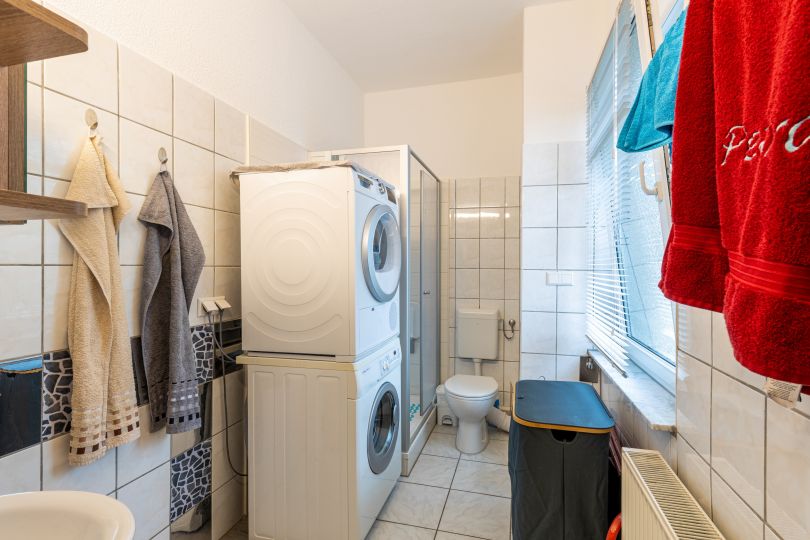 Im Erdgeschoss befindet sich eine gut etablierte Physiotherapiepraxis mit ansprechender Schaufensterfront. Diese Einheit ist langfristig vermietet und bildet eine stabile Ertragsbasis. Die vier Wohnungen in den Obergeschossen verfügen über gepflegte Ausstattungen mit Laminatböden, hellen Räumen, teilweise Einbauküchen und funktionalen Grundrissen. Tageslichtbäder, eine angenehme Raumhöhe und große Fenster verleihen den Wohnungen eine wohnliche Atmosphäre.