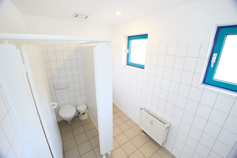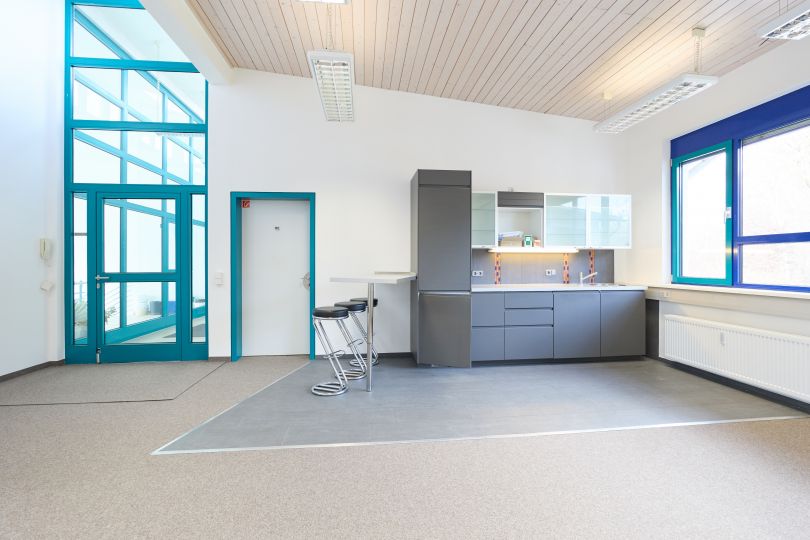 Ein praktischer Empfangsbereich mit integrierter Küchenzeile ermöglicht eine professionelle Begrüßung von Kunden und Geschäftspartnern sowie die komfortable Versorgung von Mitarbeitern mit Getränken und kleineren Speisen. Die separate Toilettenanlage mit Damen- und Herren-WC bietet eine zeitgemäße Sanitärausstattung und unterstreicht den funktionalen Gesamtcharakter der Fläche.