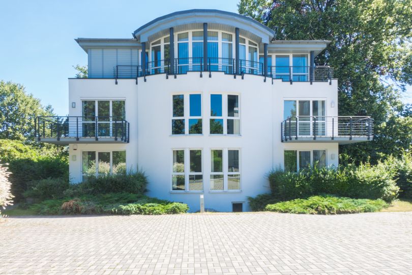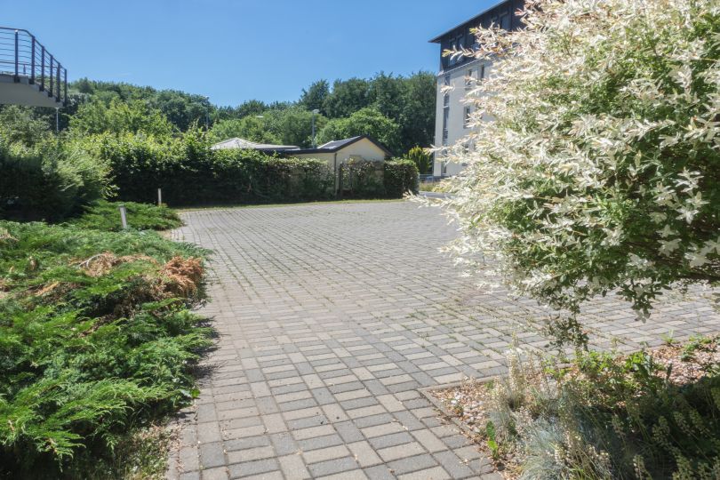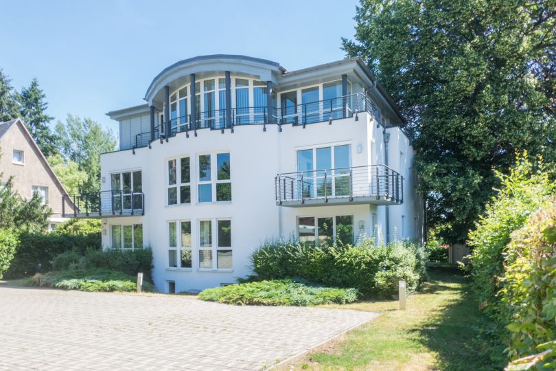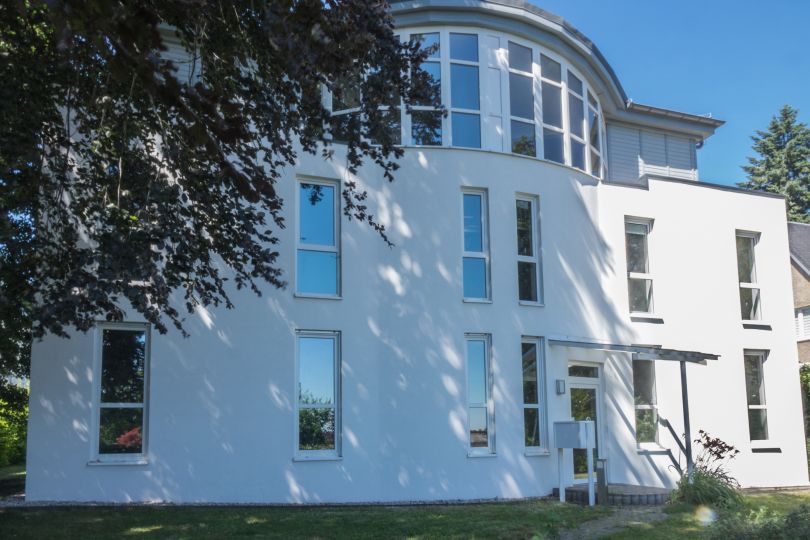 Das Bürogebäude wurde auf dem ca. 1.000 m² großen Grundstück ideal eingefügt. Der vordere Teil bietet mit sechs Stellplätzen ausreichend Fläche zum Abstellen Ihrer PKW. Weitere Parkmöglichkeiten finden Sie auf der Straße. In der Frontansicht präsentiert sich das eindrucksvolle Haus mit Balkonen und Terrassen. In villenartiger Bauweise erstreckt es sich imposant über drei Etagen. Ein gepflasterter Weg führt Sie um das Gebäude zum lichtdurchfluteten Haupteingang.