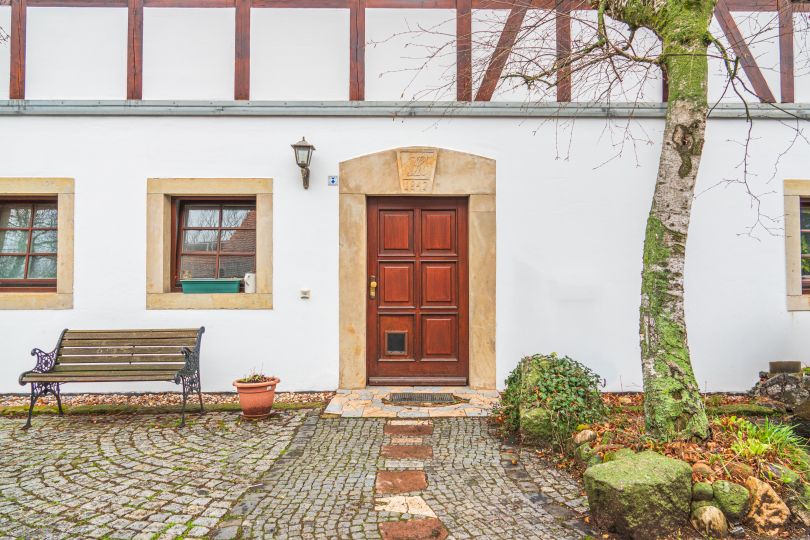 Das Grundstück umfasst drei charaktervolle Gebäude, die sich um einen zentralen, offen gestalteten Hofraum gruppieren, wodurch eine geschützte und private Atmosphäre entsteht. Das sorgfältig gepflegte Grundstück zeichnet sich durch liebevoll angelegte Grünflächen und außerordentlich gut instand gehaltene Außenbereiche aus. Zusätzlich bietet das Anwesen praktische Außenstellplätze, die eine bequeme Parkmöglichkeit für Bewohner und Besucher darstellen. Die Anlage besticht durch ihre traditionelle Architektur, die harmonisch mit den umgebenden Grünflächen verschmilzt und so ein ruhiges, ländliches Ambiente bietet.